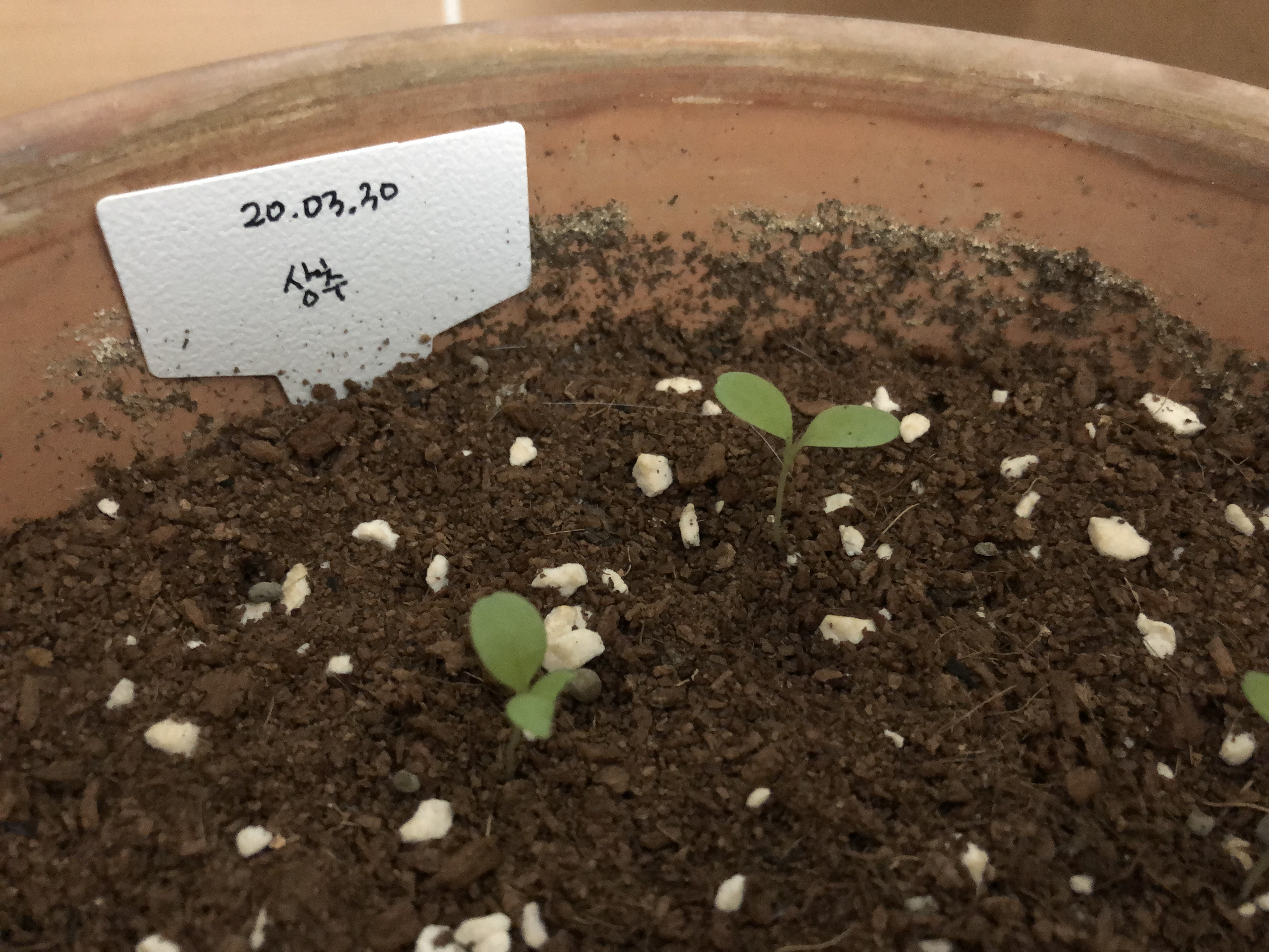 상추들은 귀여운 새싹이 되었다. 씨앗 9개 중에 8개가 발아했고 가운데 발아하지 않아서 한번 더 심어준 씨앗은 또 발아하지 않았다. 저 자리가 문제가 있는걸까...? 본잎은 언제 나올까~ 얼른 상추모양이 되었으면 좋겠다!
