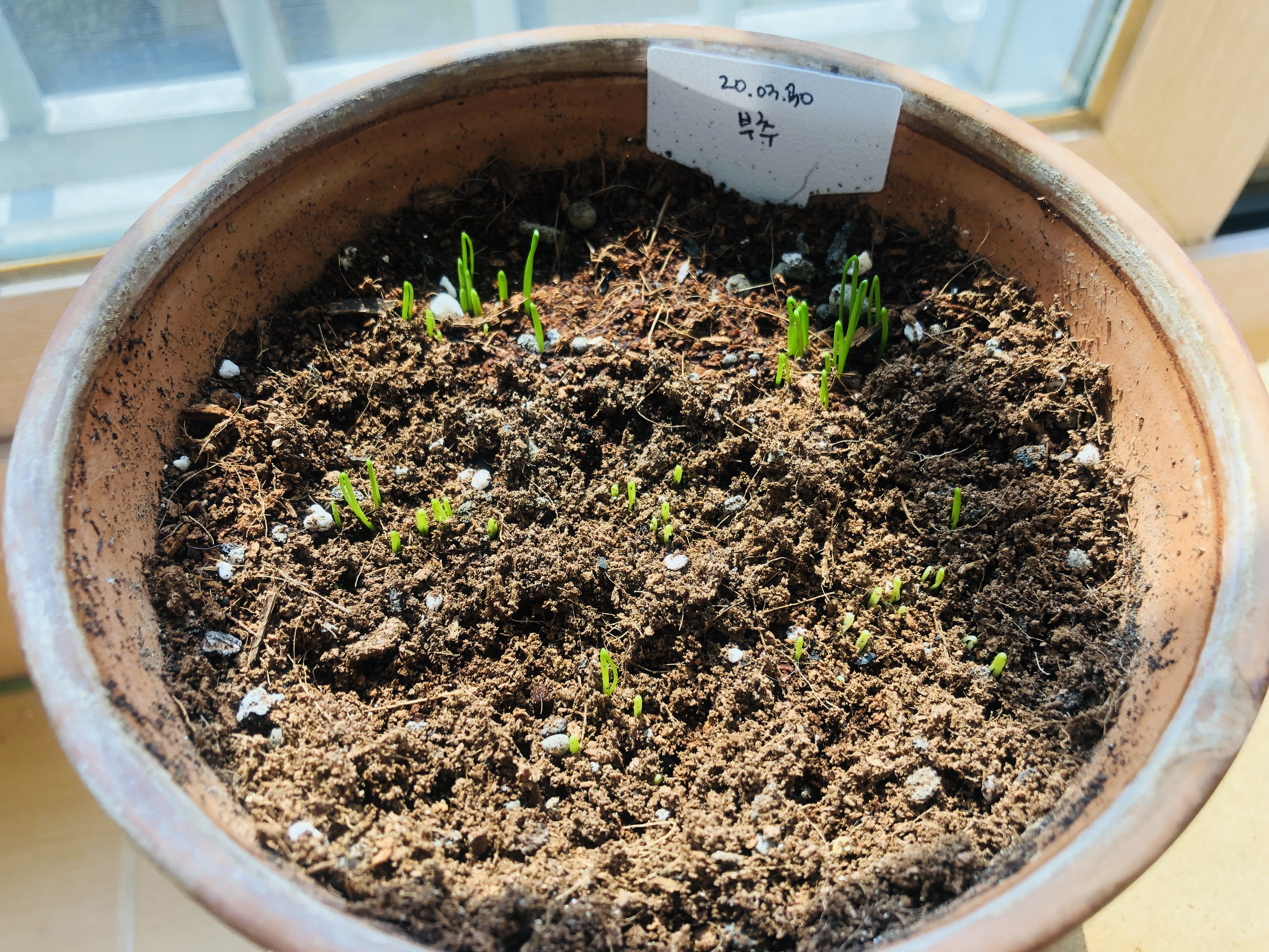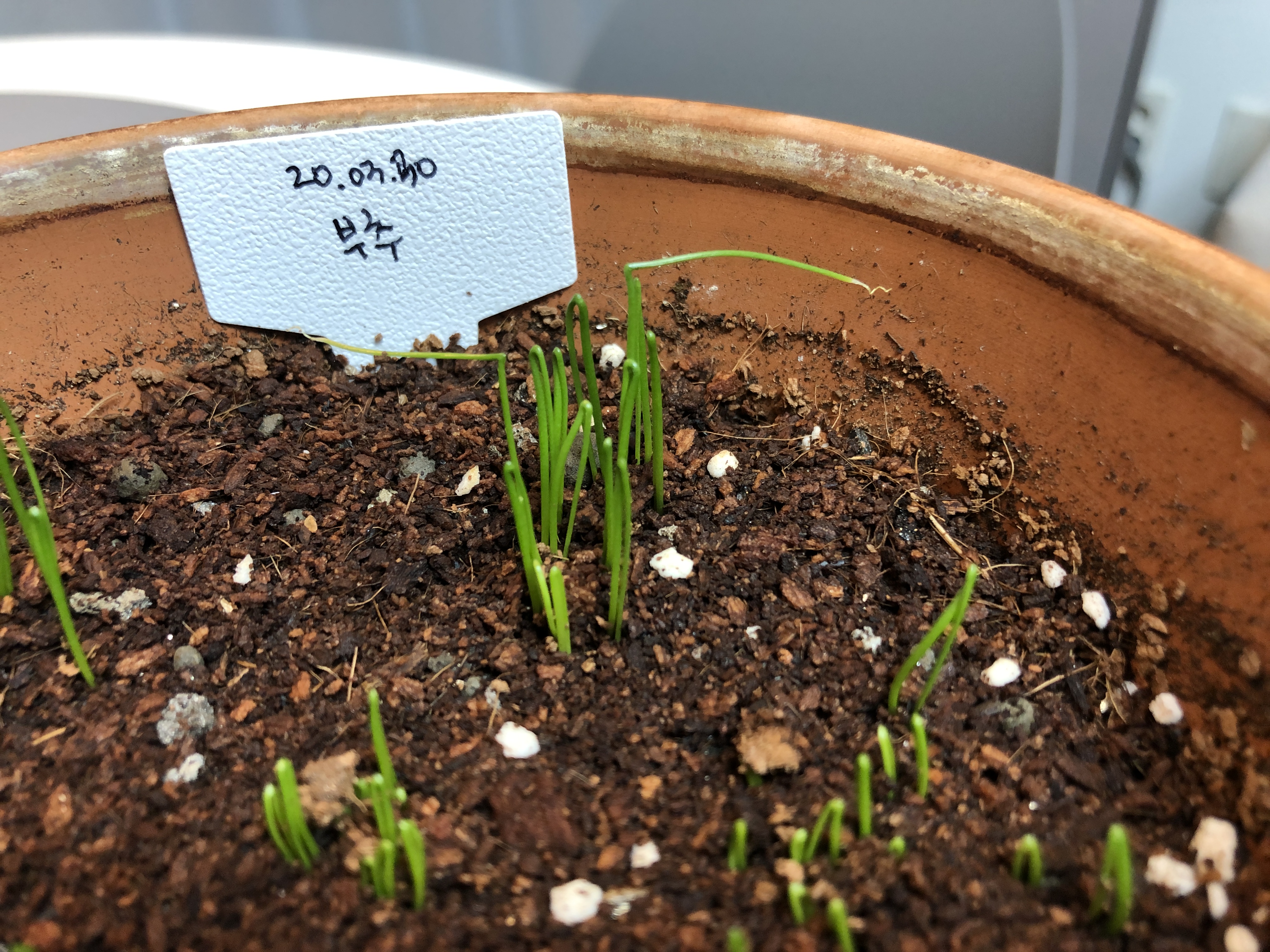 부추 새싹은 조금 더 많이 나옴. 신기하게 부추는 반 접혀있은 모양이다. 저게 펴지는걸까? 아니면 합쳐지는 걸까? 부추의 탄생을 지켜보는 신기한 경험 중이다.