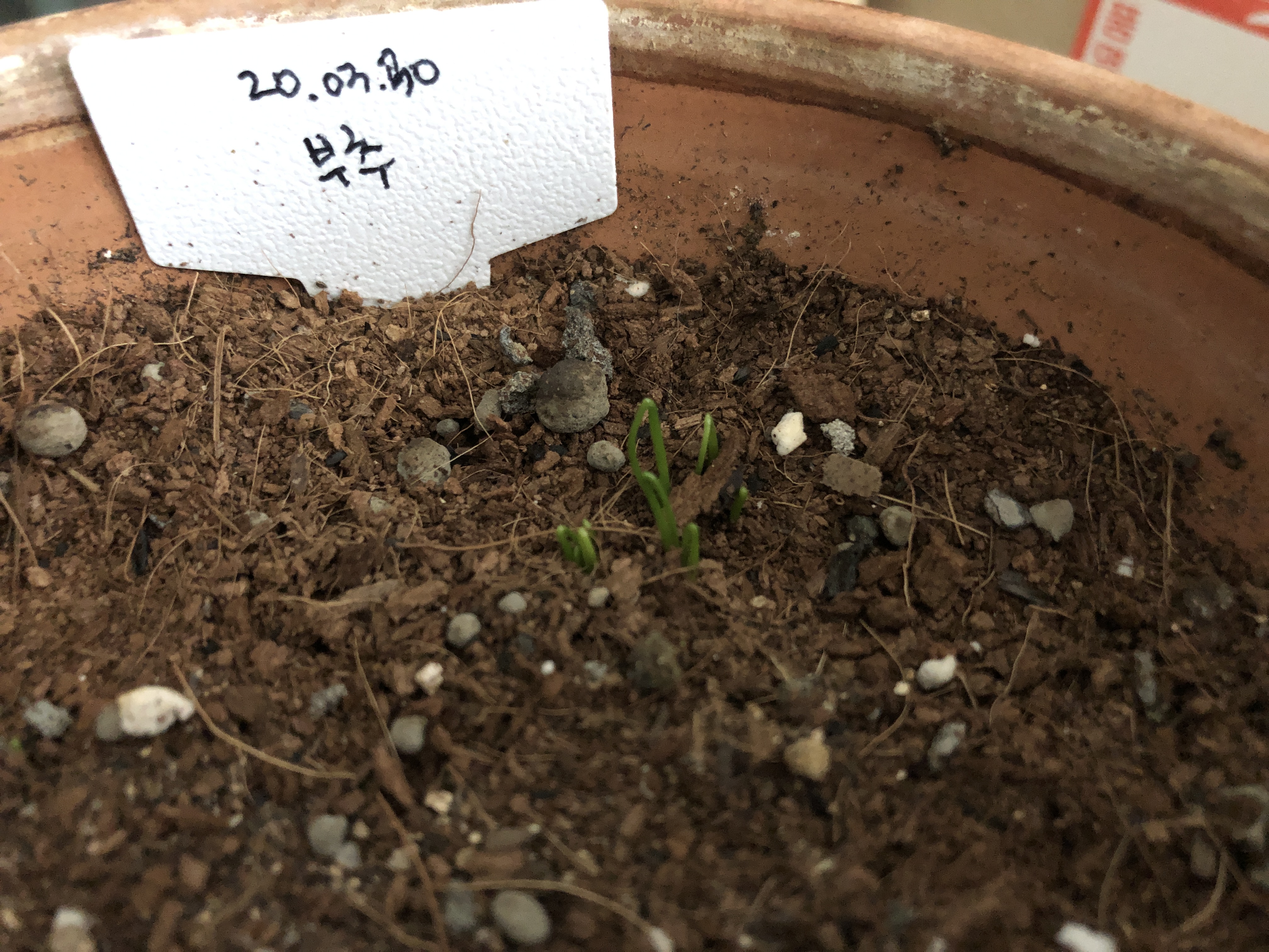 부추가 드디어 빼꼼히 고개를 내밀었다!! 역시 내가 씨앗 위로 흙을 너무 두껍게 덮어주었나보다. 흙을 살살 걷어낸 자리에 마치 피지같이(...) 부추들이 고개를 들 준비를 하고있었다.