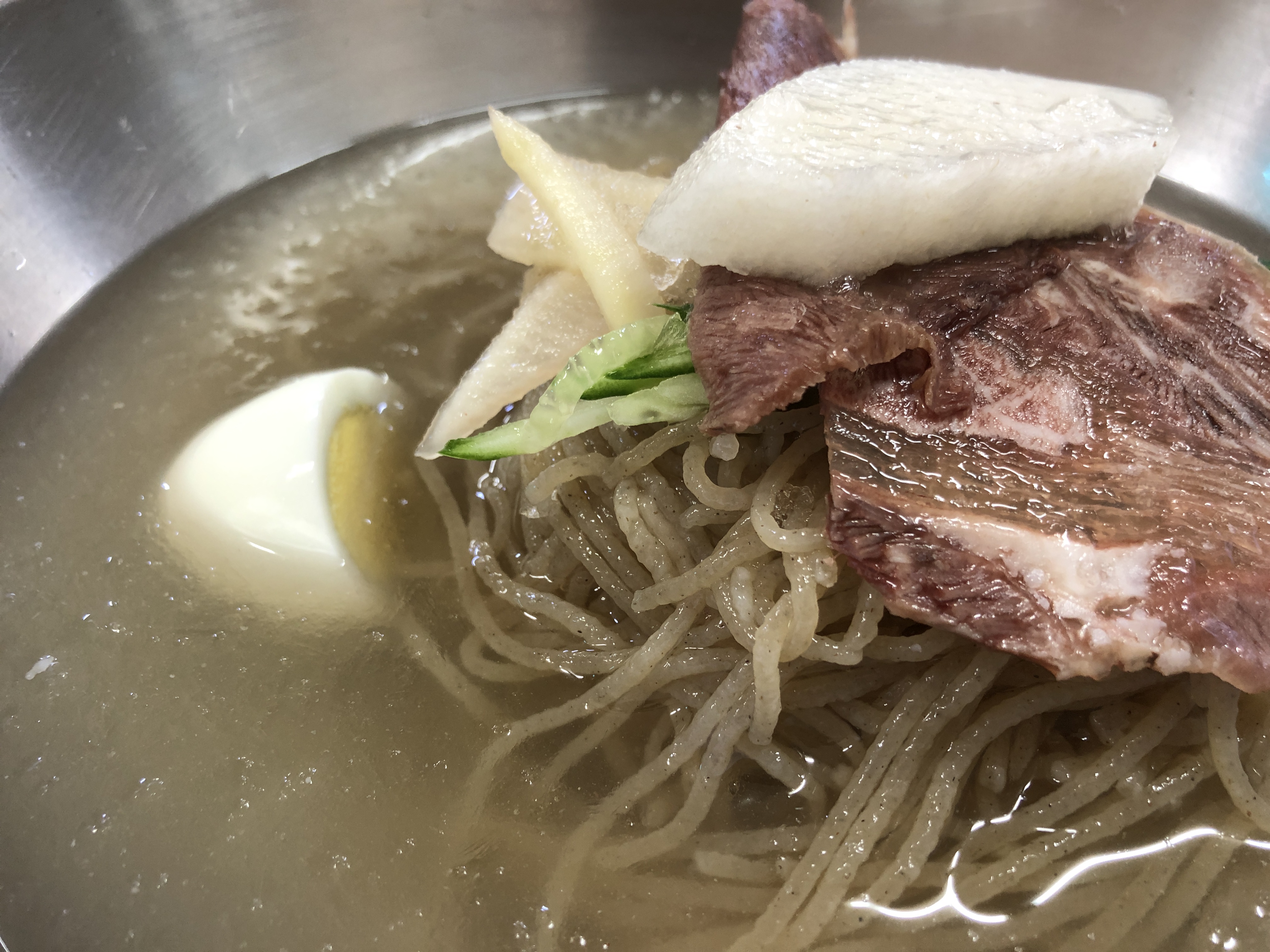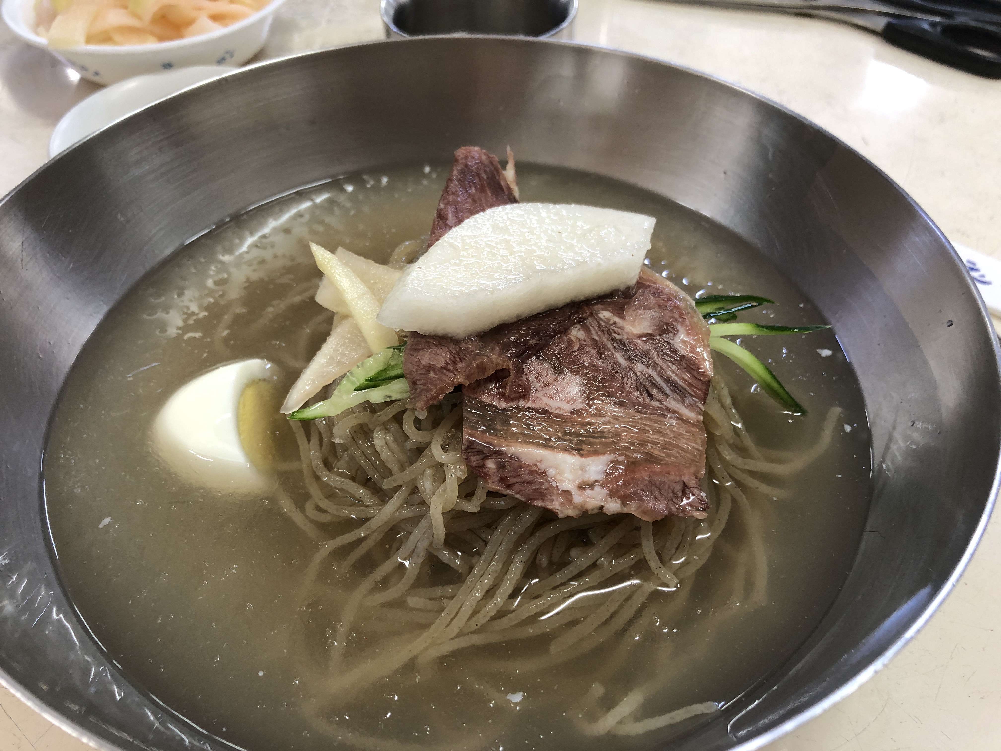 오, 살얼음이 동동 떠있는 육수에 얇은 고기, 오이, 무와 계란, 배 한조각이 올려져 있다. 일단 육수를 한모금 해보니 시원한 고기 육수 맛이 났다. 오오.