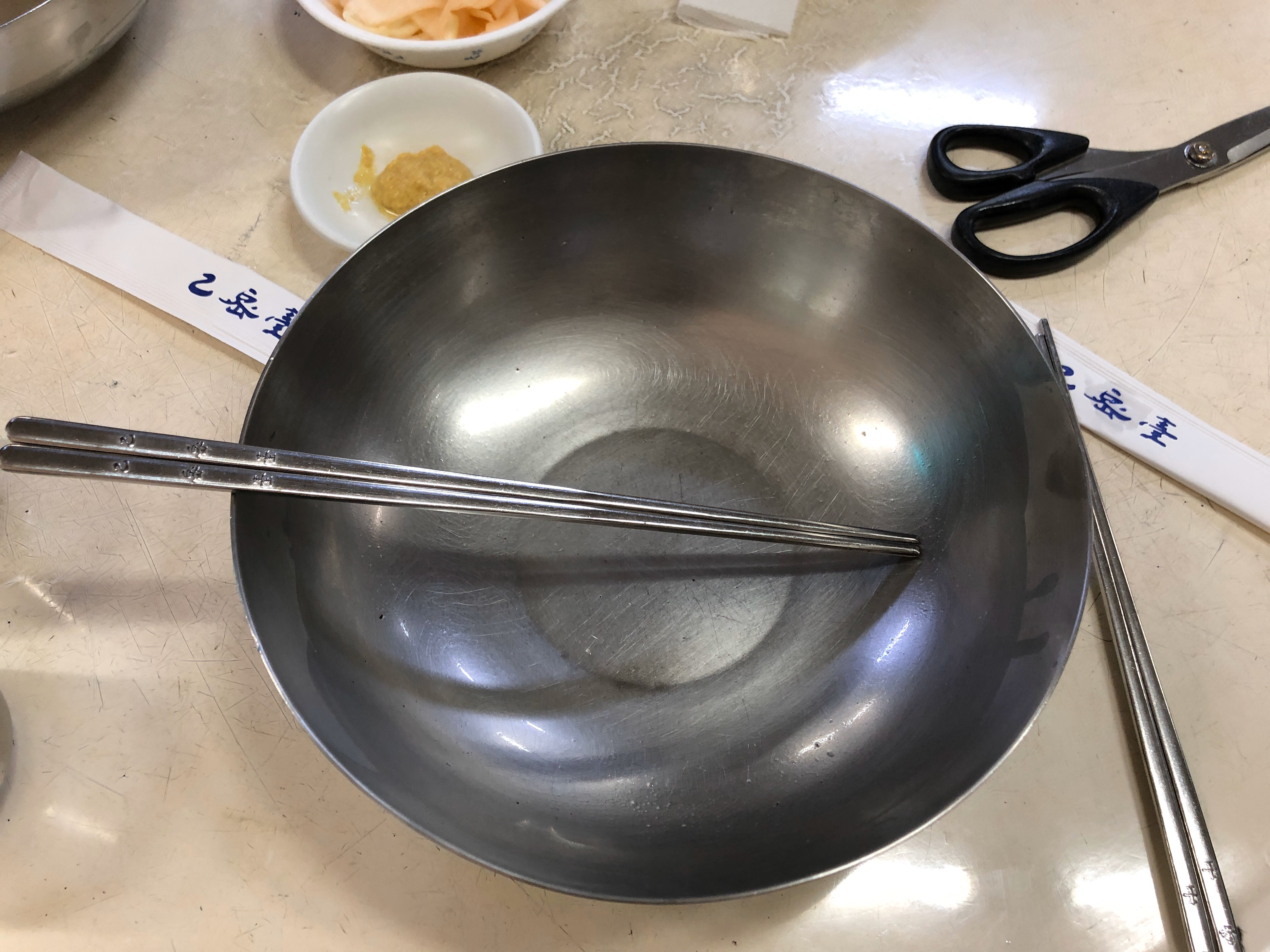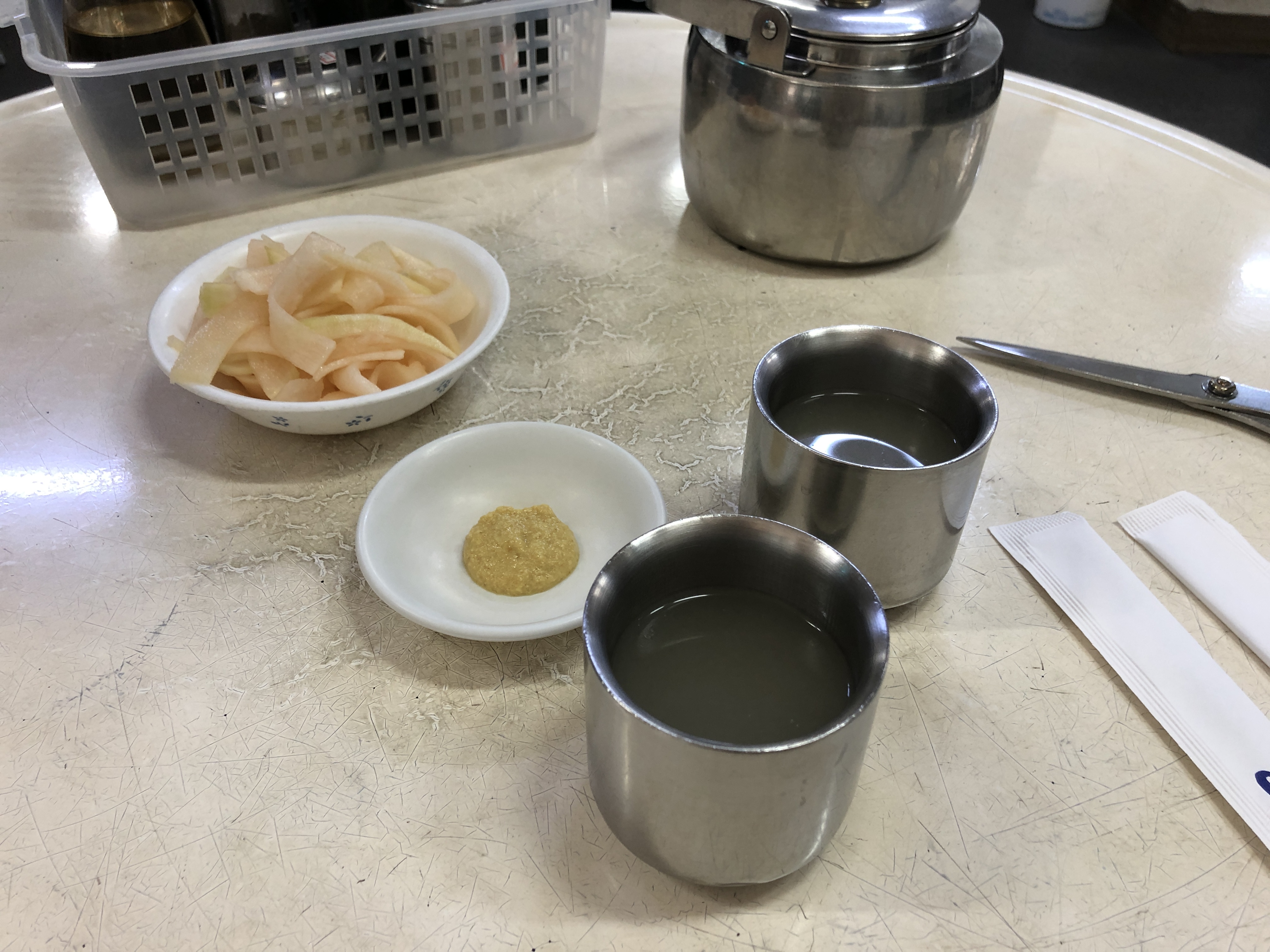 간단한 기본 세팅. 무절임, 겨자, 따뜻한 고기육수.