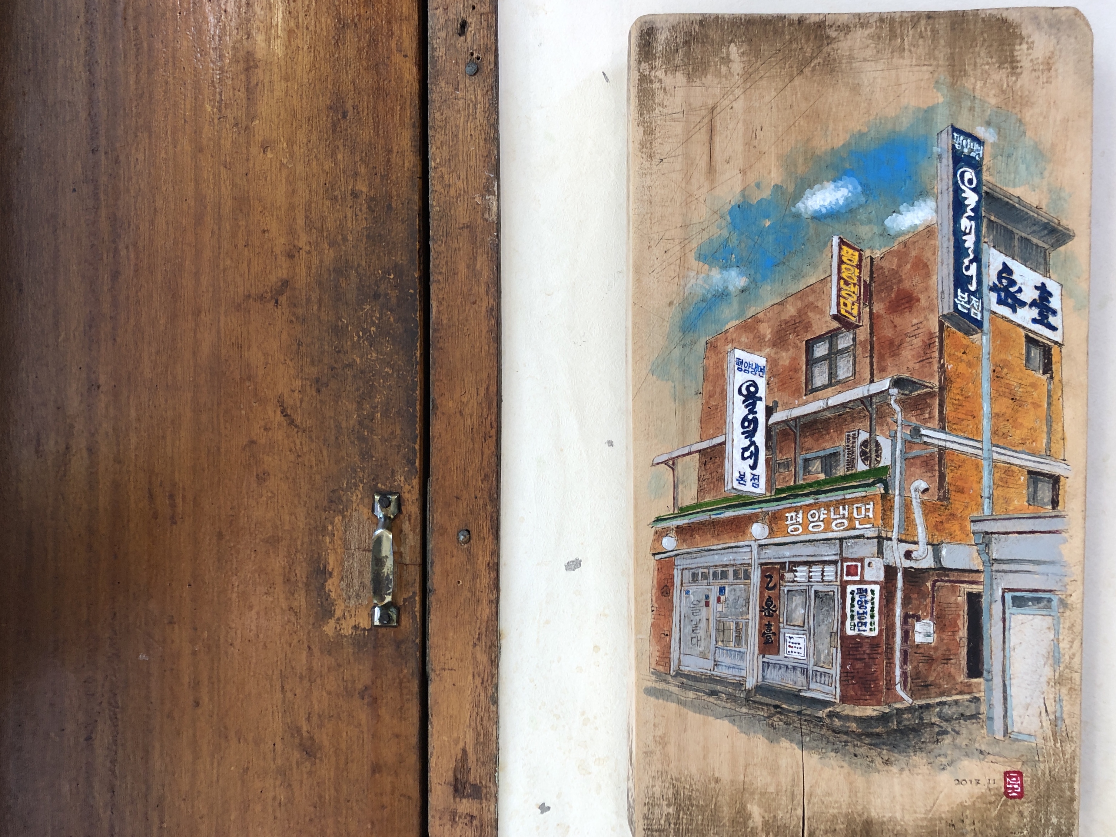 언제부터 있던 간판인지 모를, 굉장히 레트로한 아우라를 뿜는 평양냉면 간판. 겨울에도 하고 면을 직접눌러 뽑는다고 합니다. 아주 오래된, 촌스러운 이 뷰가 어쩐지 힙해보이는 건 레트로가 유행이어서일까? ㅎㅎ 기분이 좋아서였을까? 같은 을밀대인 옆 건물에서 노릇노릇 녹두전 굽는 냄새가 너무 구수해서였을까..?