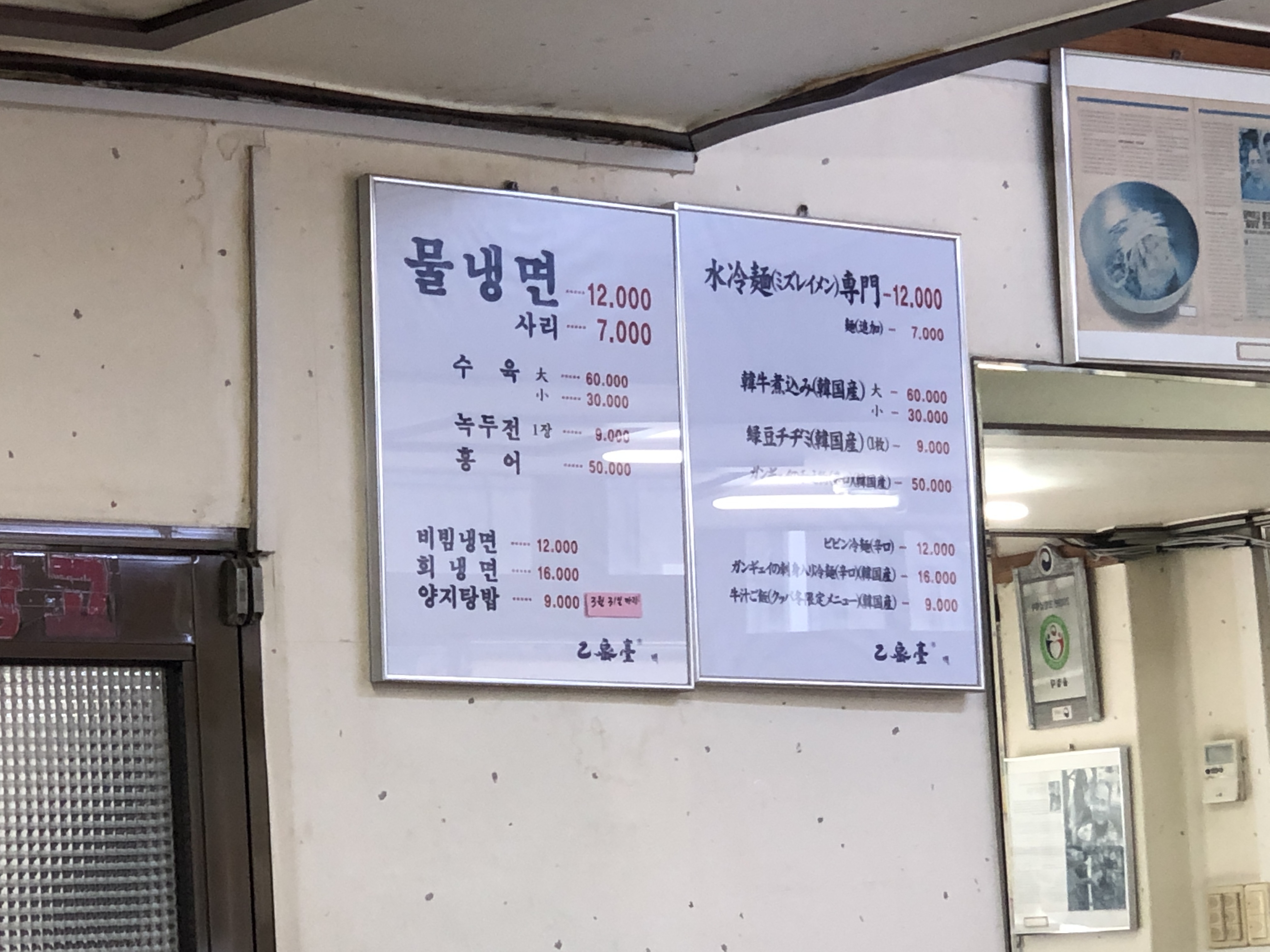 다른 가게에 방해가 되지 않게 골목 안쪽으로 줄을 섰다. 우리가 줄을 서고 정말 얼마 지나지 않아 우리 뒤로도 줄이 나라비로 늘어섰다. 와우. 겉으로 봤을 땐 허름하고 작은 냉면집 같았는데, 알고보니 확장을 많이하여 건물 하나가 다 을밀대였고, 골목을 끼고있는 옆 건물도 을밀대였다. 2층도 있고 뒷방도 있고 옆건물에서도 먹을 수 있었다. (다만 꽉 차 있을 뿐..)