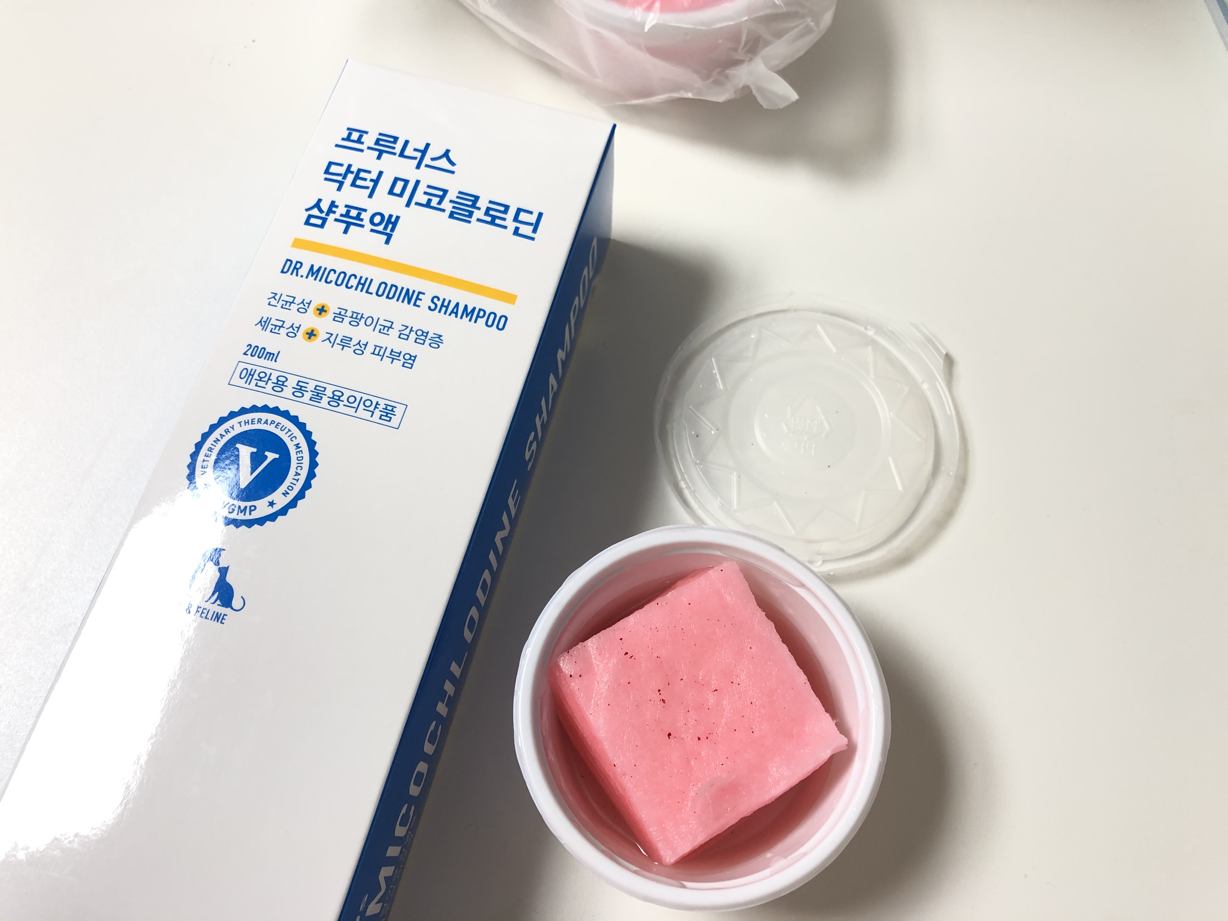 프루너스 닥터 미코클로딘 이라는 약용 샴푸. 세균성 피부염과 곰팡이균 감염에 효과가 있다고 한다.