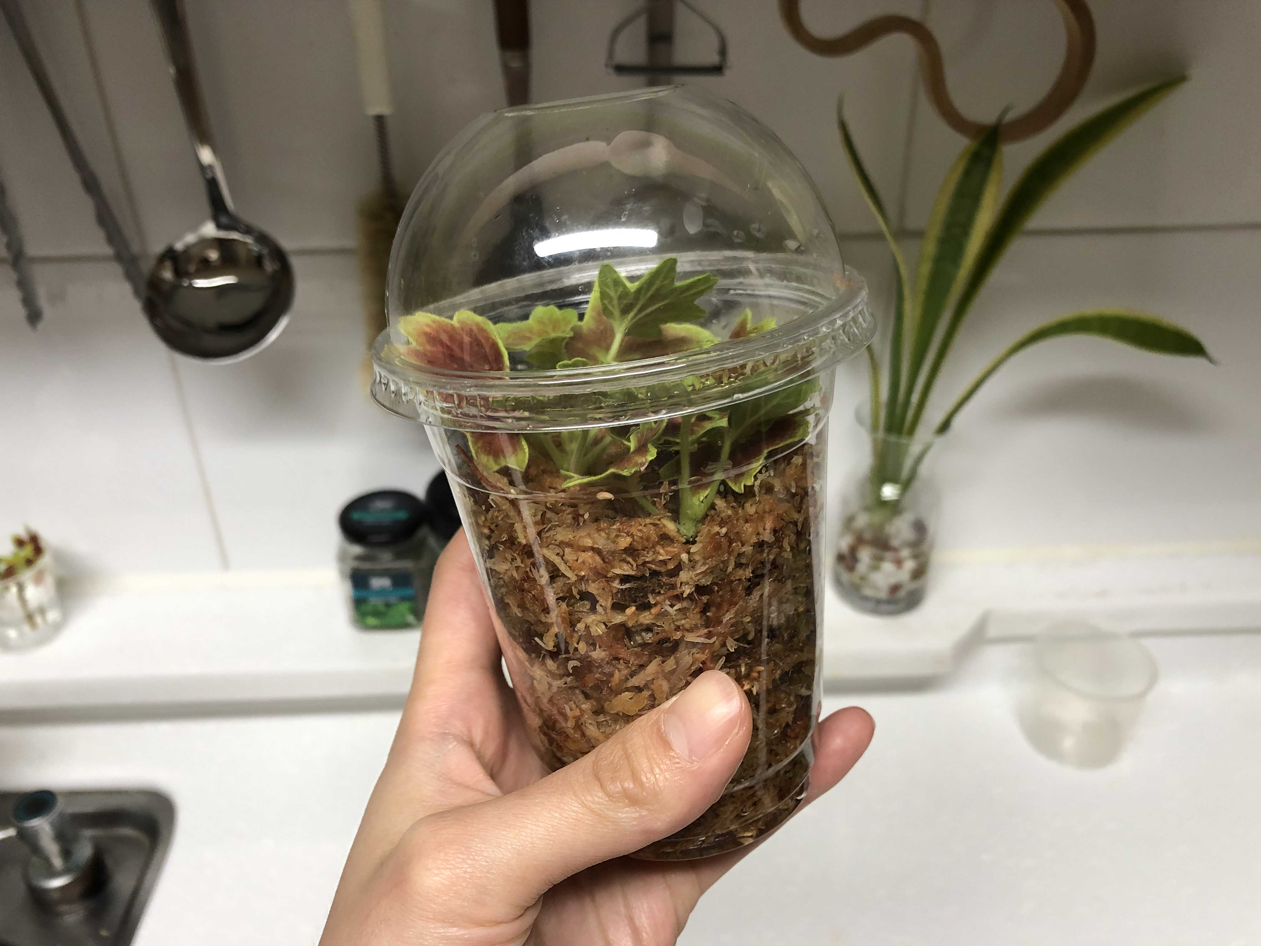 뚜껑 위가 뚫려있어 통풍이 되면서도 수분이 쉽게 날아가지 않는 구조여서 식물 인큐베이터 하기 딱 좋은 것 같음. 아래 물이 2센치 정도 남아있어 보름이 지나도록 수태가 촉촉하게 전혀 마르지 않았다.
