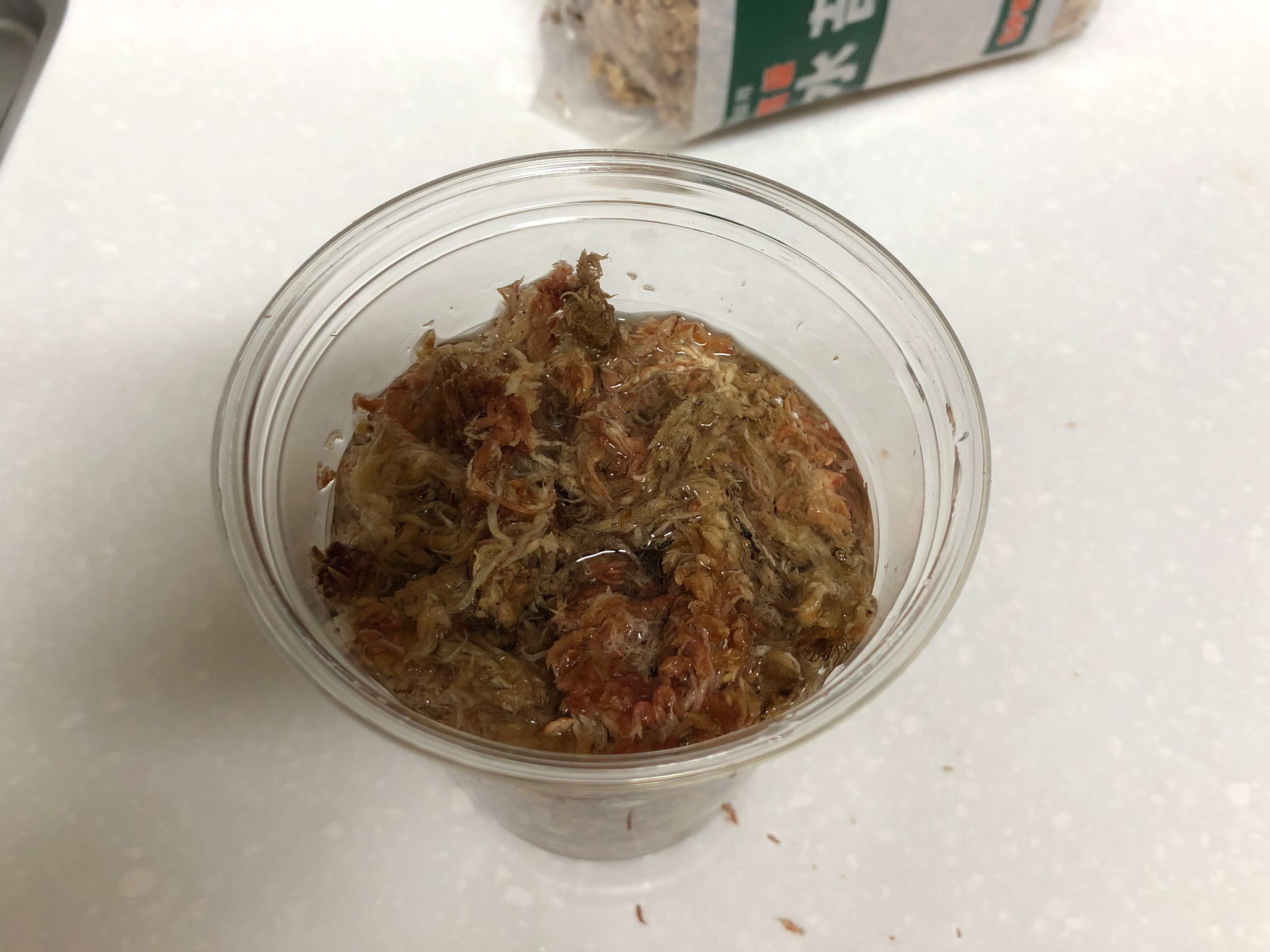 일회용 커피컵에 수태를 담고 물에 불려 가위로 잘게잘게 잘라준다. 나중에 삽목이에서 뿌리가 나면 수태와 뒤엉켜 분리하기 쉽지 않기 때문에 수태를 잘게 잘라줘야 한다고 한다.
