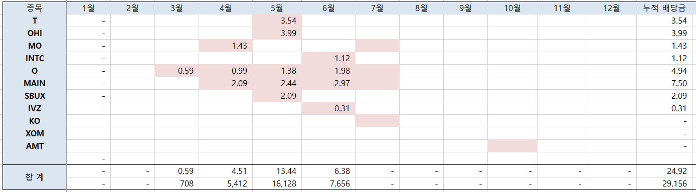 3월부터 배당금을 받기 시작하여 총 4달 째 적지만 꾸준히 배당금을 지급받고 있다. 미국 주식 수익률은 완전히 회복되지 못하고 있지만 기계적으로 조금씩 매수하여 AMT라는 새로운 종목도 생겨났다. AMT는 배당락 며칠이 지난 이후에 사서 10월이 되어서야 배당금을 지급받을 수 있을 예정 ㅜㅜ 아시비.
