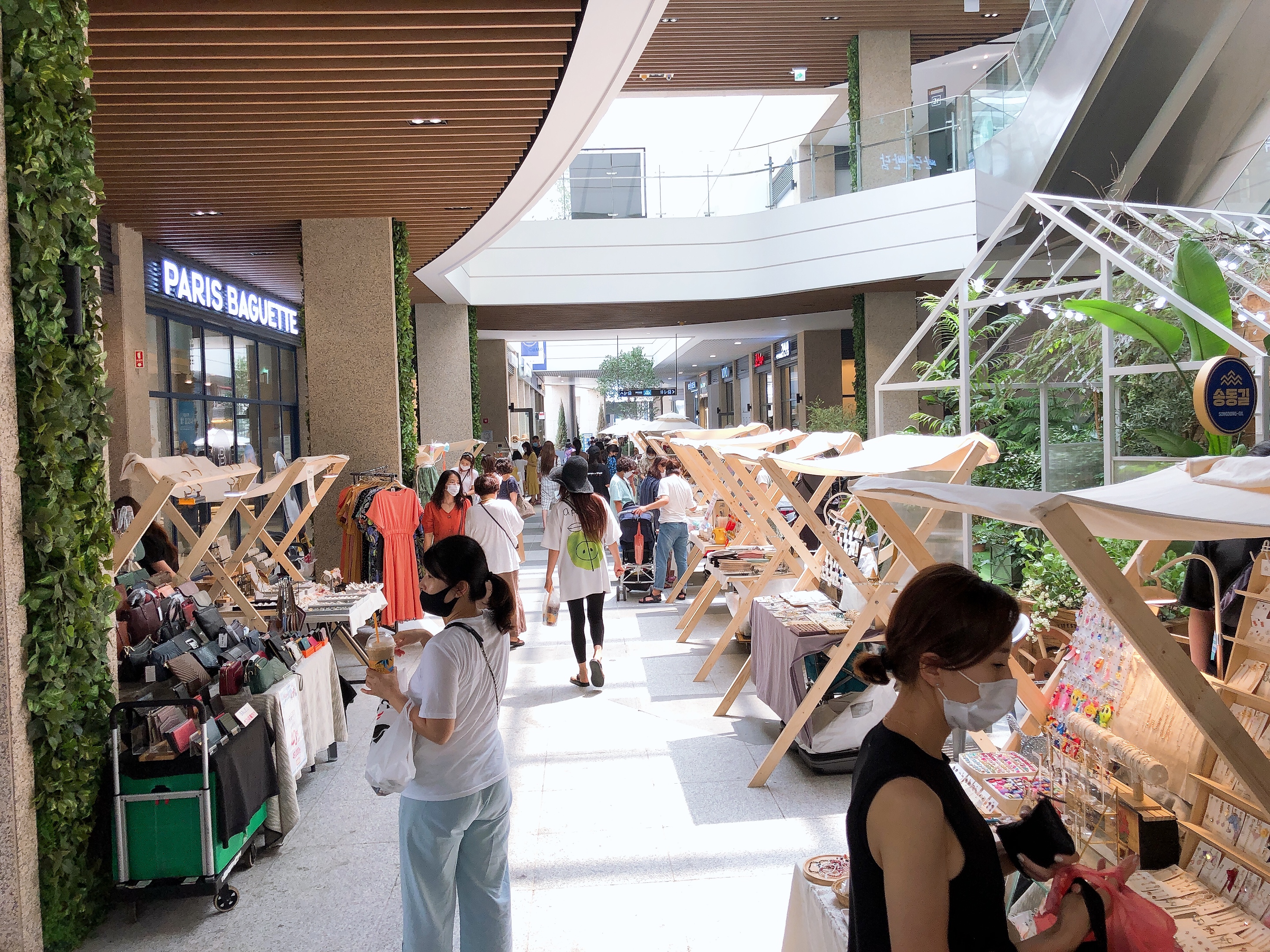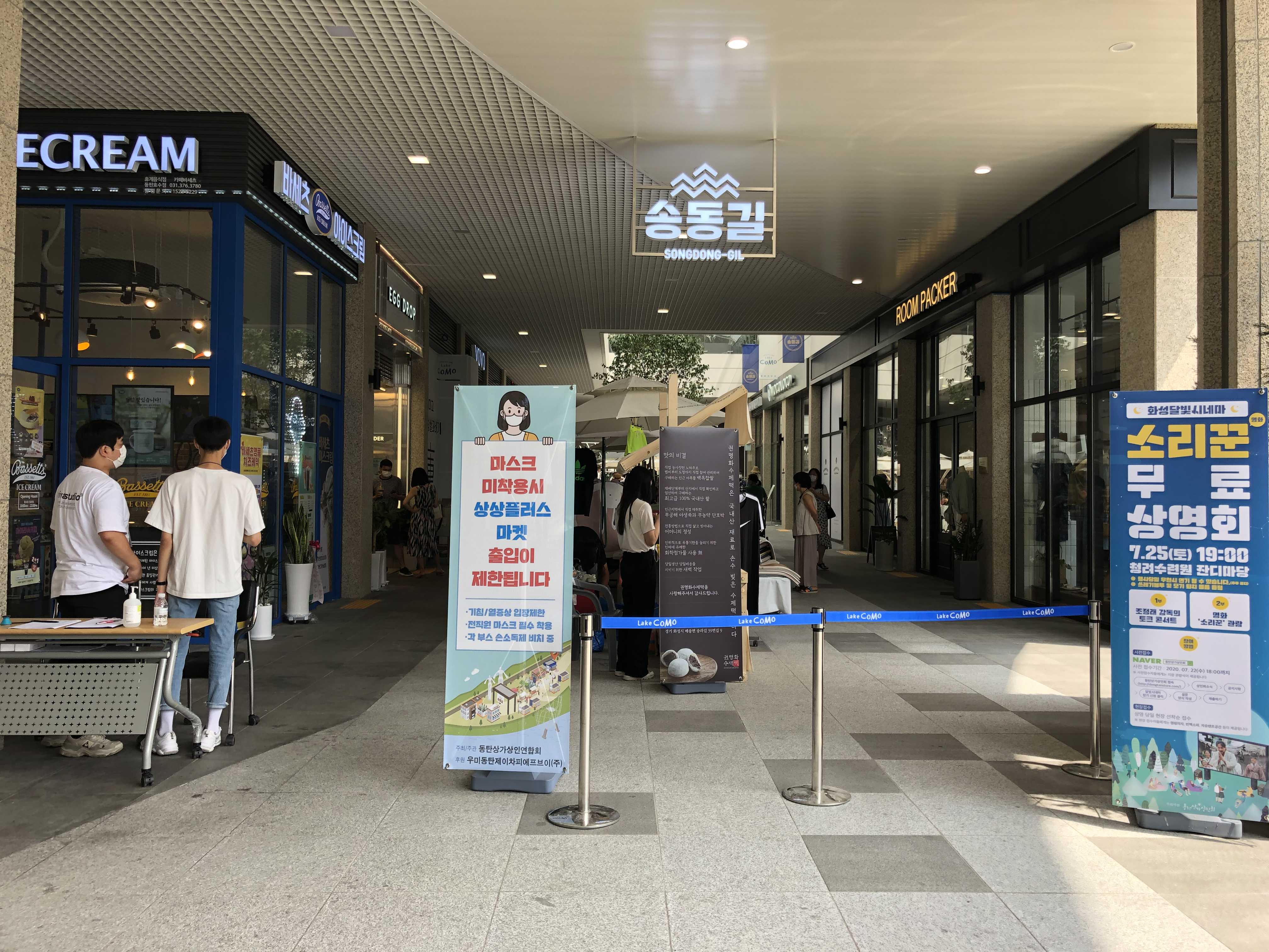 송동길 입구 앞에서 체온을 재고 출입기록을 적어야 플리마켓을 이용할 수 있다. 진행요원이 돌아다니며 셀러들과 이용자들이 마스크를 잘 썼는지 확인하고, 잘 쓰지 않았으면 마스크를 쓰도록 지도한다. 아무래도 한정된 공간에 사람들이 몰리다보니 코로나에 대비해 나름 신경써서 대비하고 있는 듯.
