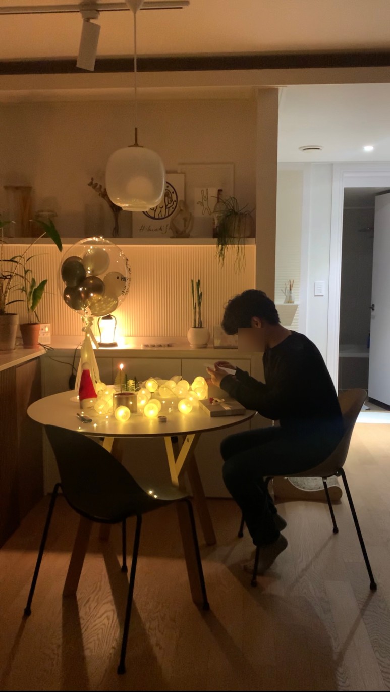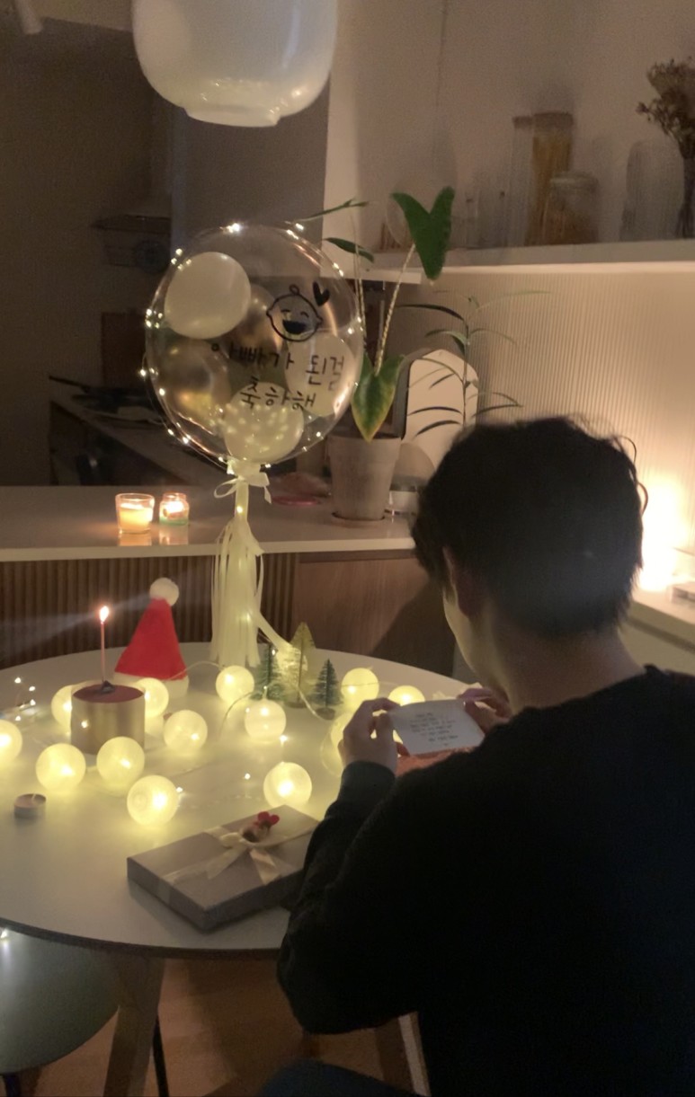 남편이 불꺼진 집안으로 들어오면 테이블에 보이는 반짝반짝한 전구와 풍선ㅡ, 그리고 상자를 열어보니 짜잔~!