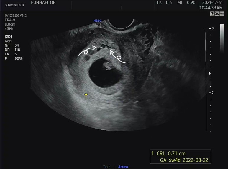 초음파 상에서 자궁벽 주변으로 피고임이 보였다.