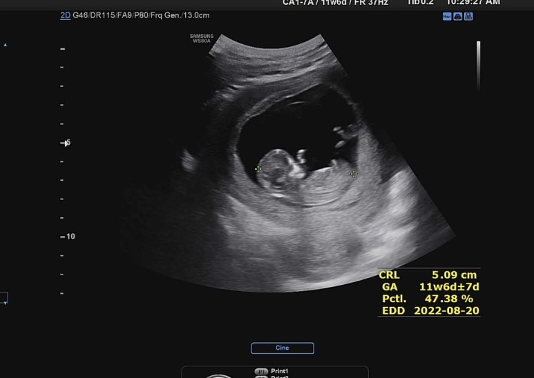 5센치가 넘었구나~ 이 시점부터는 태아가 구부리고 있어 총 길이를 잴 수 없어 머리에서 엉덩이까지의 길이로 크기를 확인한다. 5cm를 손가락으로 가늠해보면서.. 너는 아직 요만하구나 헤헤.