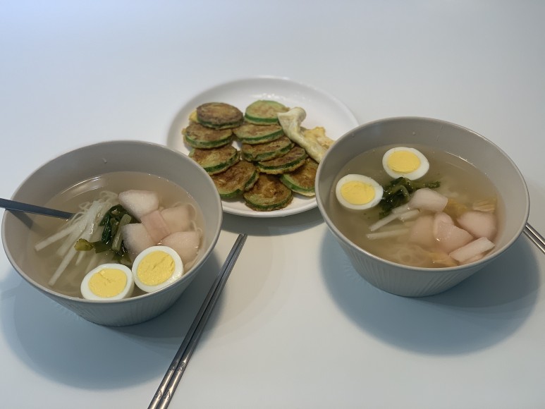 주말 점심. 어머님이 보내주신 동치미로 만들어 본 동치미 국수와 남편 최애반찬 호박전.