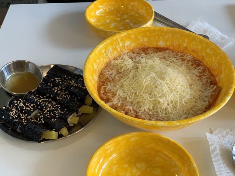 눈꽃치즈떡볶이는 떡이 누들떡인데 너무 많이 끓인 것인지 떡이 넘 흐물흐물했다. 떡볶이 양념이랑 치즈는 맛있었고, 마약꼬마김밥은 와사비소스 안찍어먹으면 쏘쏘한 맛.