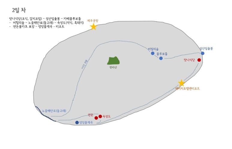 2일차 : 맛나식당(조식, 갈치조림) – 성산일출봉 – 카페블루보틀 -비밀의숲 – 노을해안로(돌고래) – 숙성도(석식, 흑돼지) -연돈볼카츠 포장 – 엉덩물계곡 - 리조트