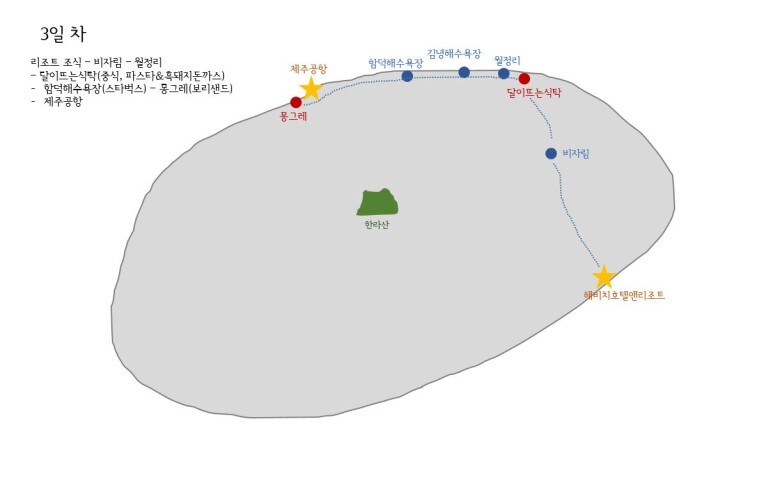 3일차 : 리조트 조식 – 비자림 – 월정리 – 달이뜨는식탁(중식, 파스타&흑돼지돈까스) -함덕해수욕장(스타벅스) – 몽그레(보리샌드) -제주공항