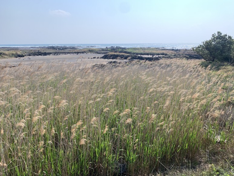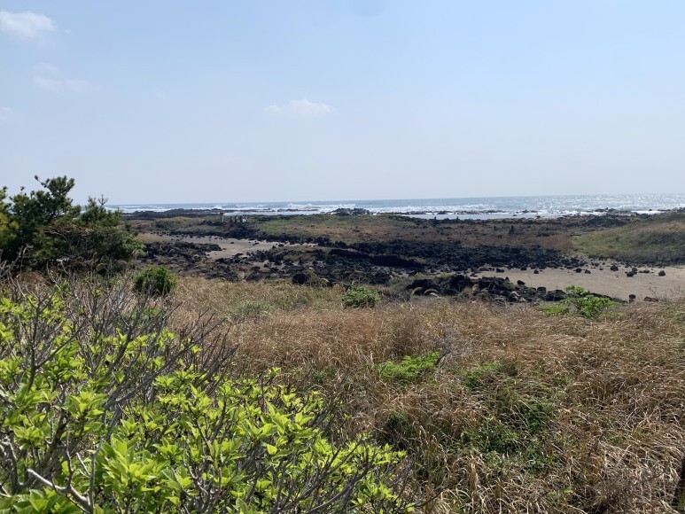 낮은 풀과 검은 돌. 정비되지 않은 자연스러운 제주바다의 모습.
