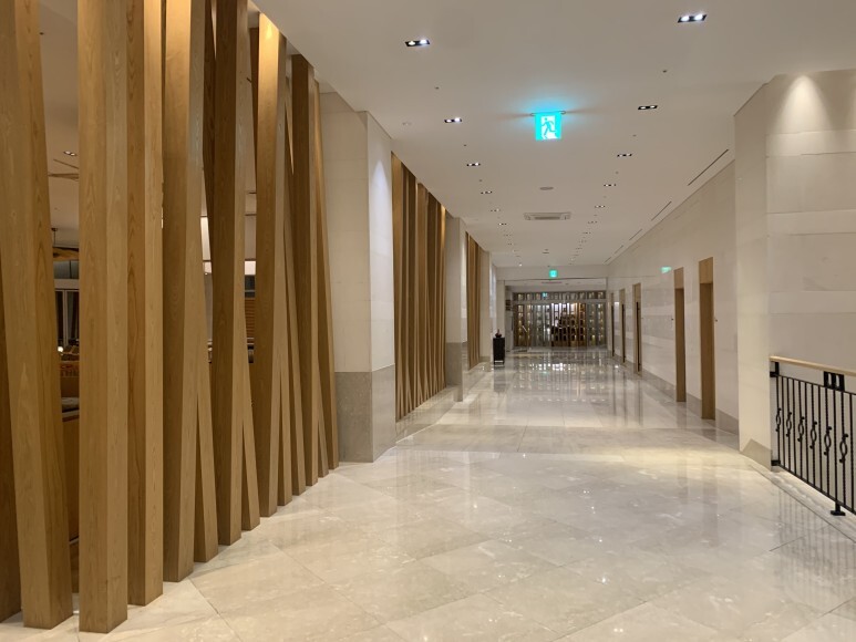 물결치는 우드 루버와 베이지톤의 대리석 인테리어.