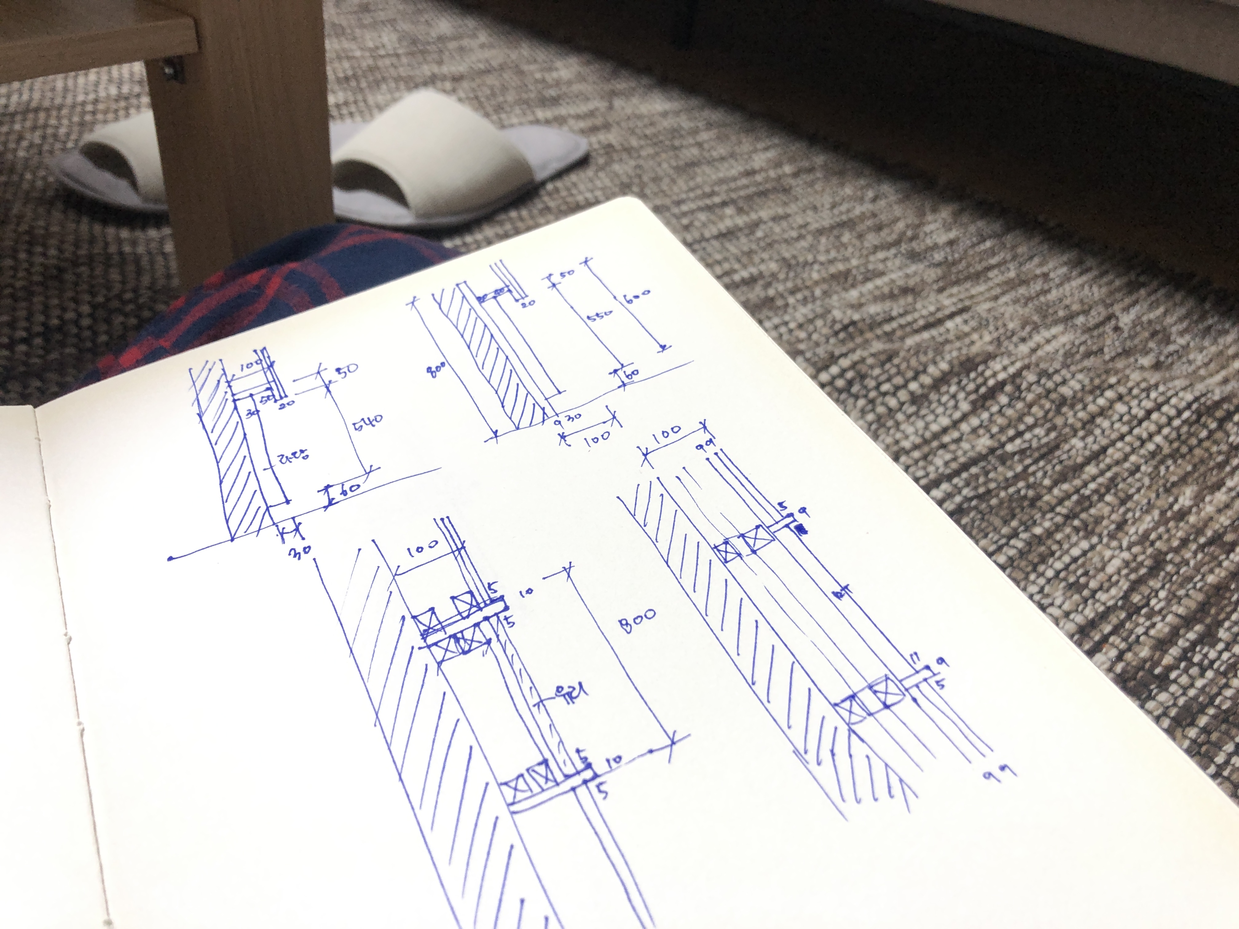 어젯밤에 남편 하루와 투게더를 퍼먹으면서 열심히 고민한 외부 이미지월 디테일. 벽으로부터 120이라는 한정된 두께 안에서 백페인트 글라스도 매입해야하고 하부 루버와 그 안에 간접조명까지 넣어야 한다. 공간ㅇ 부족해 생각해 낸 해법은 라왕 루버 위에 T5를 올리는 것.