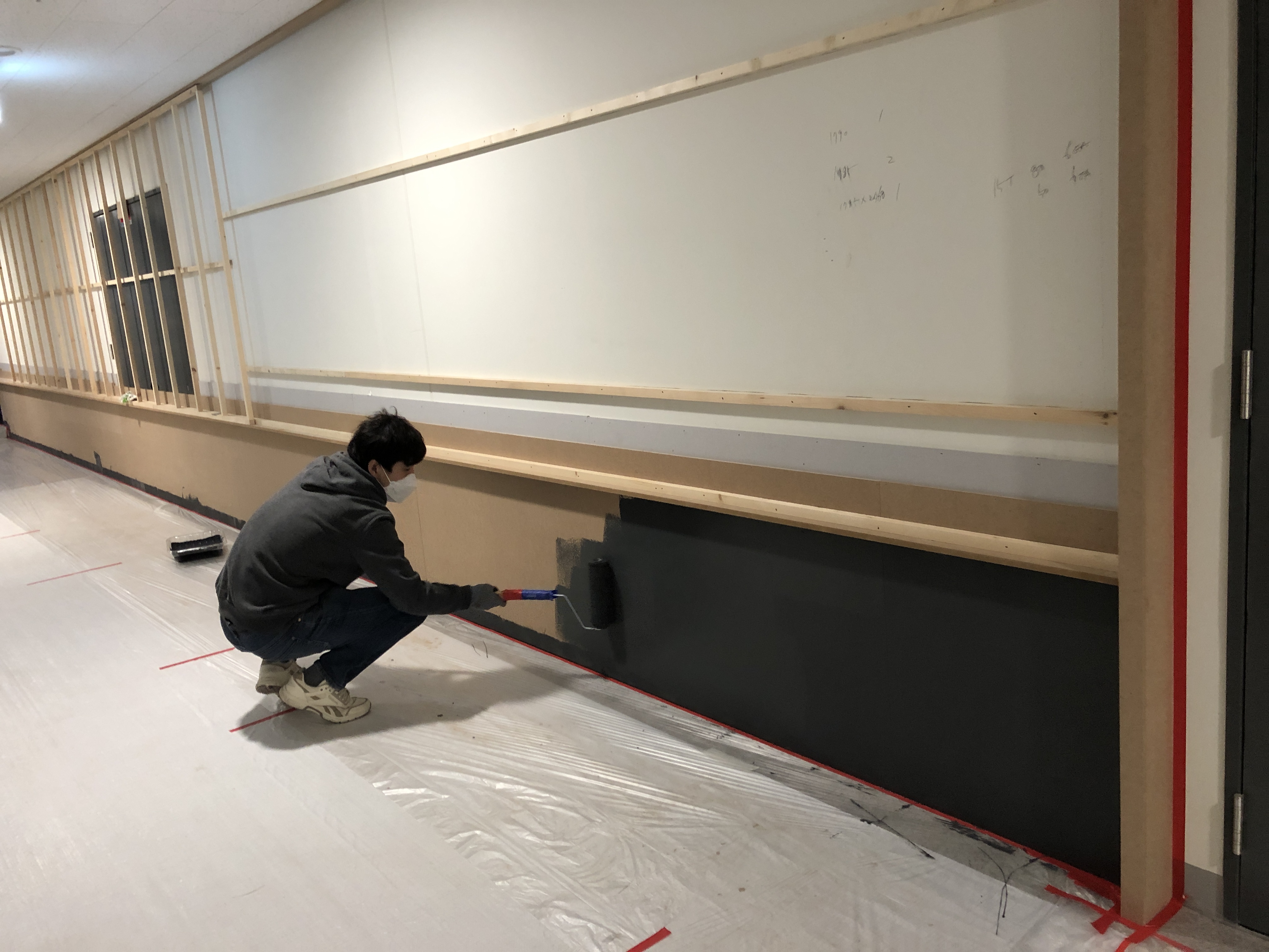 내일 목공이 이미지월을 완성하기 전에 24로 재단한 라왕 합판에 투명락카페인트를 4면 칠해놓아야 하고, 라왕이 붙을 바탕면도 짙은 회색으로 칠해놓아야 하고, 발코니 철거구간 바닥 미장을 끝내놓아야 한다. 전직원이 총출동해서 셀프페인트+미장 야간작업. 인테리어회사 직원이 시공팀 안쓰고 셀프인테리어가 웬 말이요.